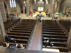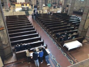 Gedurende de maand maart brachten de tien brugklassen van het Boni om beurten een bezoek aan onze St.-Aloysiuskerk. Aan de hand van opdrachten gingen de leerlingen op ontdekkingstocht langs verschillende onderdelen van het kerkgebouw, zoals het doopvont, een Mariabeeld en het altaar. Daarnaast probeerden zij de twaalf apostelen — afgebeeld op de houten panelen in de koepel — te benoemen en maakten zij een tekening van een van de veertien kruiswegstaties.