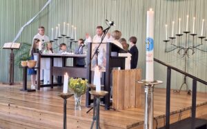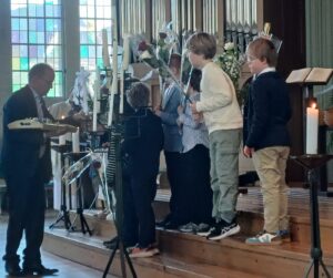 Tijdens de viering hadden de kinderen allerlei taken, zoals voorlezen, altaarkaarsen aansteken en de altaartafel gereed maken. Tijdens het Eucharistisch Gebed stonden ze allemaal rond de tafel.