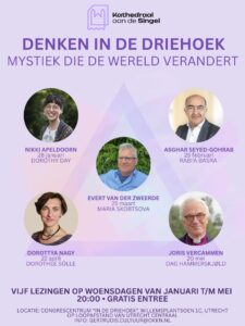 Wereldverandering en mystiek lijken soms elkaars tegenpolen. Toch laat Denken in de Driehoek in 2026 zien hoe mystieke spiritualiteit juist kan leiden tot radicale betrokkenheid bij de wereld. Vijf mystiek geïnspireerde vrouwen en mannen uit verschillende culturen en tijdperken staan centraal. Hun geloof beweegt hen tot zorg voor de schepping, strijd tegen onrecht, gastvrijheid, vrede en diepe menselijkheid.