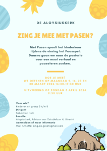 Met Pasen zondag 5 april om 9.30 uur speelt het kinderkoor tijdens de viering het Paasspel. Na het paasspel gaan we met alle kinderen naar de pastorie voor een mooi verhaal en paaseieren zoeken. Kom je ook?