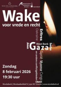 Op zondag 8 februari vindt om 19.30 uur in de Nicolaikerk (Nicolaaskerkhof 8) weer een Wake voor vrede en recht plaats. We kunnen niet zwijgen over het geweld dat om zich heen grijpt. In de wake worden stemmen gehoord van mensen die geweld ondergaan of ertegen in opstand komen. Het grijpt ons aan. In de wake roepen we tot God, geven de slachtoffers een stem en geven elkaar de ruimte. De wake vindt sinds september 2025 afwisselend plaats in meerdere Utrechtse kerken. Iedereen is van harte uitgenodigd mee te doen.