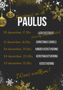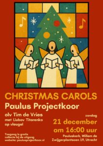 Op zondag 21 december 2025, 16.00 uur, kun je je even onderdompelen in de warme, onvergetelijke klanken van traditionele Christmas Carols. Onder de bezielende leiding van dirigent Tim de Vries en met Liubov Titarenko op de vleugel brengt het Paulus Projectkoor klassieke kerstmuziek ten gehore. Van het ingetogen Bleak Midwinter en Es ist ein Ros’ entsprungen tot de uitbundige klokken van Ding Dong! Merrily on High.